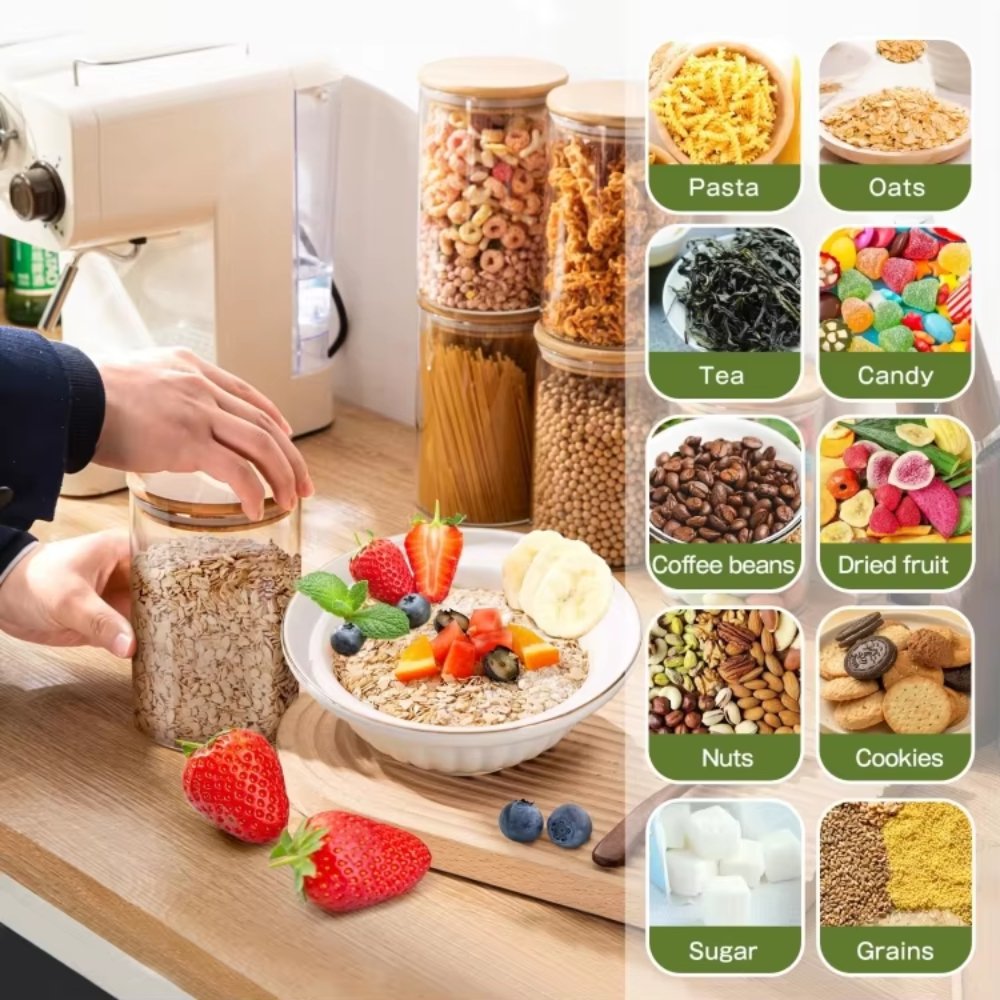 Crafted from durable, high-quality glass, these jars not only preserve flavor but also allow you to quickly identify the contents. The eco-friendly bamboo lids feature a silicone sealing ring that securely locks in freshness, making them ideal for all your seasoning essentials.